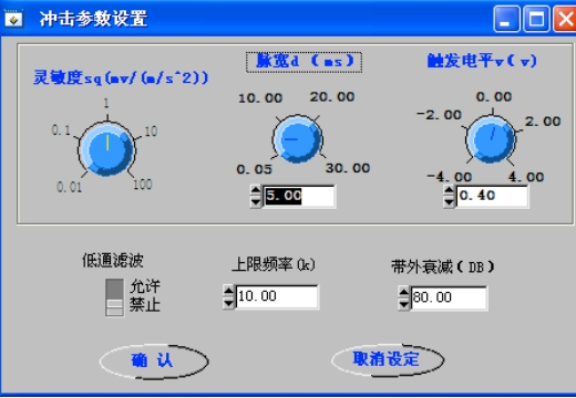 2到最大的脈沖加速度15000g,如果選用一個加速度傳感器,在保證最大測量范圍的前提下,傳感器的靈敏度都很高,在小量級測試時,由于輸出電量很低,難以采集到沖擊脈沖波形。因此,設備專門配備了兩只型號的加速度傳感器,一只是最大量程只到30000m/s